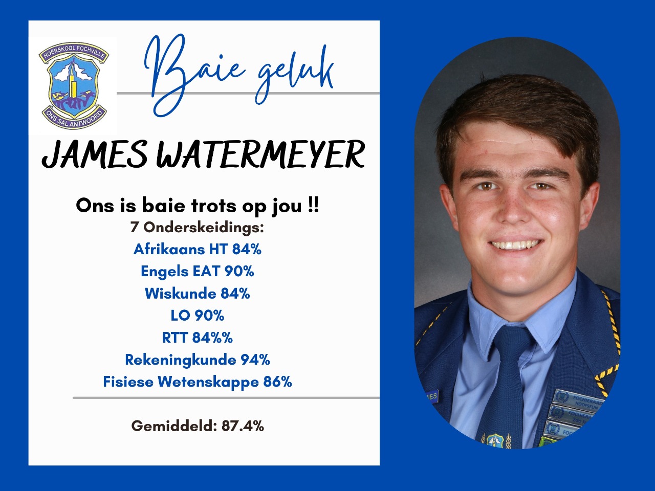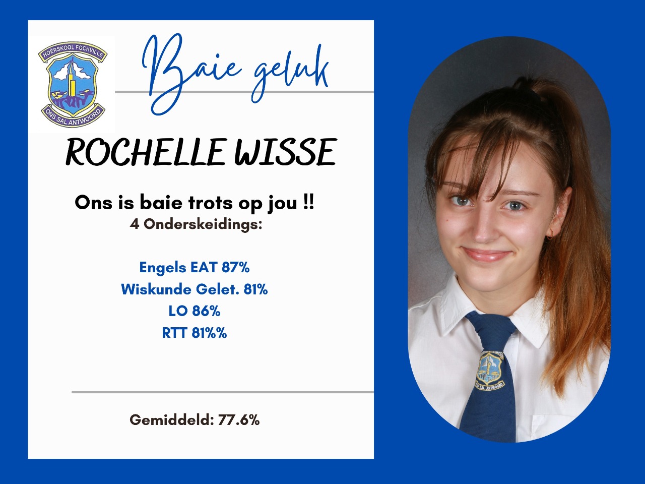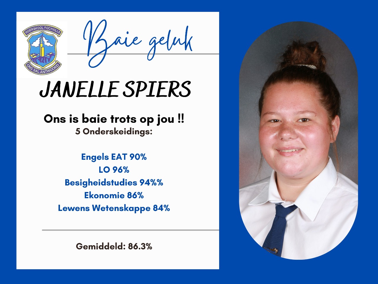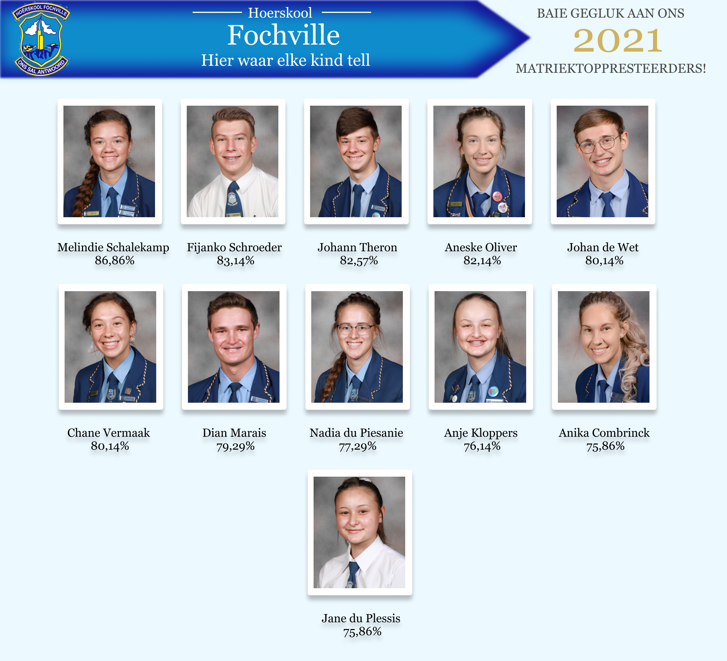 Die toppresteerder van Hoërskool Fochville is Melindie Schalekamp, met gemiddeld van 86,86% . Sy het sewe onderskeidings behaal . Hoërskool Fochville is sommer baie trots op haar ! Melindie gaan veeaartsenykunde by Onderstepoort studeer . Sy het dikwels self lekker dinge opgeoffer en eerder gesit en studeer , omdat sy geweet het hoe streng die keuring is . Sy het veral in haar matriekjaar aan God se plan vir haar en aan Jeremia 29 : 11 vasgehou .Ons wens haar alle sterkte toe met haar studies en weet dat sy n sukses sal maak van wat sy ook al aanpak.
